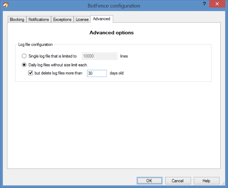 - Logfile options: You can either let BotFence write a single log file that is shortened to the amount of lines configured here (oldest entries thrown out first) or configure BotFence to keep individual daily log files without any size restrictions. In that case you can also have BotFence remove older log files after a preset number of days has passed.