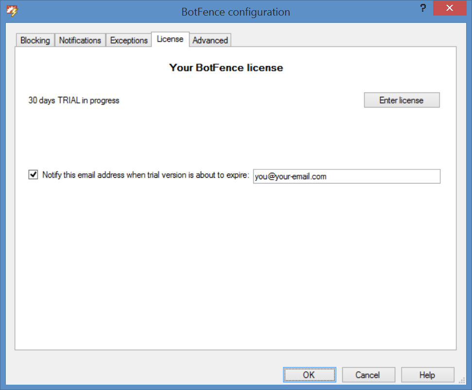 BotFence starts out as a free 30 day trial version. If you want to use the software beyond the 30 days trial you need enter the license code on this page.. The license is then activated by the software and the 30 day limit is removed. There is no need to reinstall the software or reconfigure anything else.