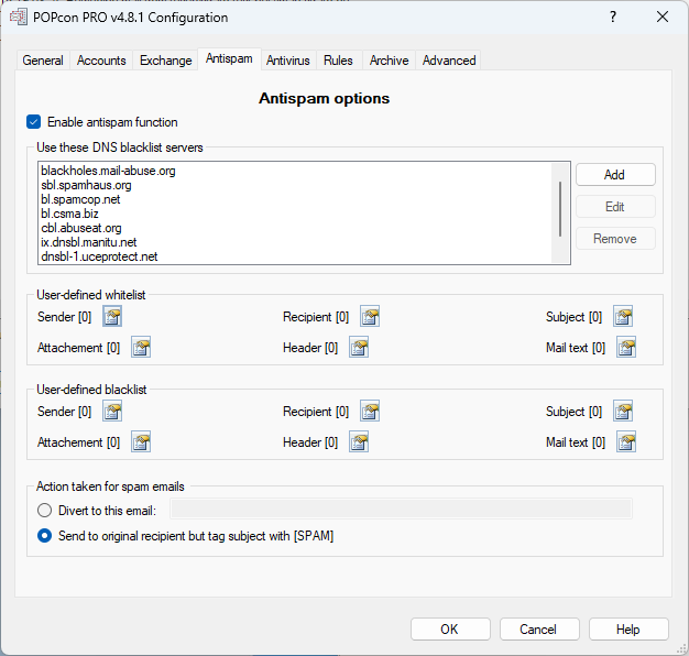 This dialog allows you to configure how POPcon handles spam emails using DNS blacklist servers and user-defined whitelists and blacklists. It also defines the action taken when an email is marked as spam.