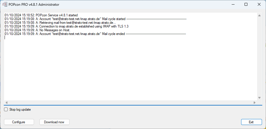 The Download now button manually triggers an immediate download of emails from the configured email servers. Normally, POPcon checks for new mail at regular intervals, but this button allows users to force a mail cycle outside of the normal schedule.