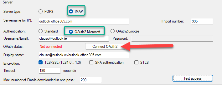 Note: The IP port number for Microsoft IMAP with OAuth is 993, as shown below.