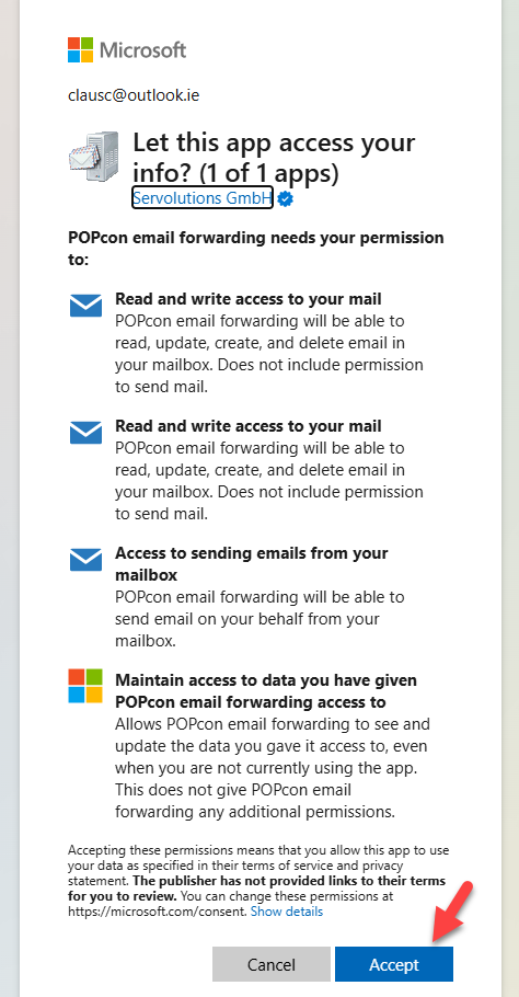 Microsoft will ask for permission to allow POPcon email forwarding to read, update, create, and delete emails from your Outlook account. Review the permissions and click Accept to grant access.