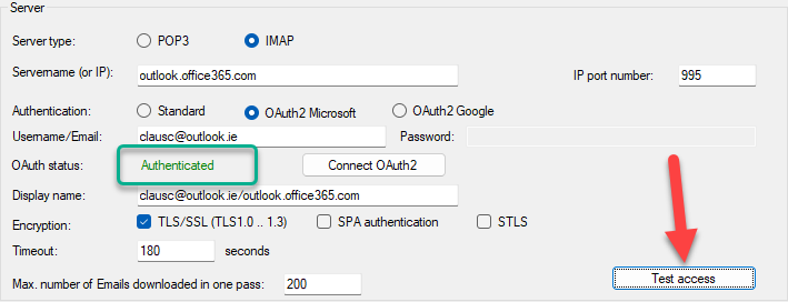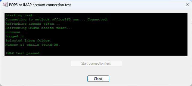 POPcon will test the connection to your Microsoft Office 365 or Outlook online account. If the test passes successfully, you are all set to retrieve emails using OAuth authentication.