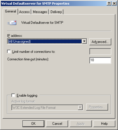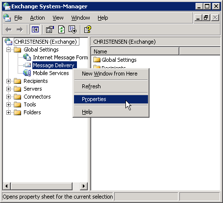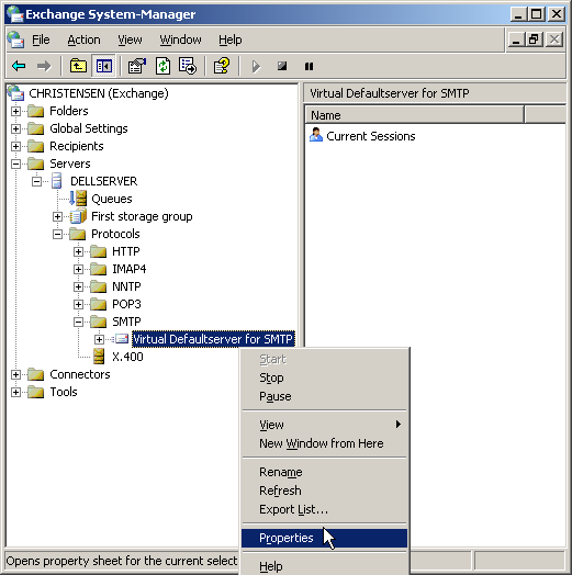 • You will find the settings for the SMTP server under Servers/Protocols/SMTP/Default SMTP Virtual Server. Open the properties by right-clicking on the Default SMTP Virtual Server and choosing "Properties":