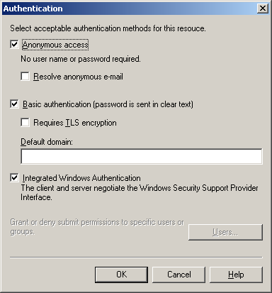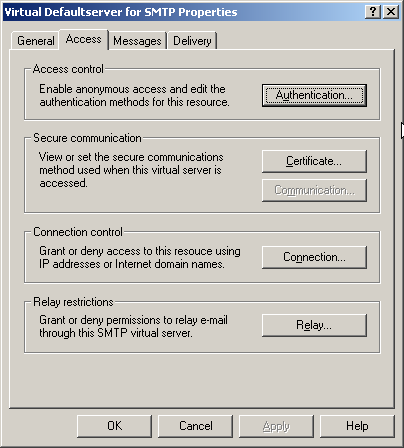 • POPcon only works with a standard SMTP connection WITHOUT authentication, so allow "Anonymous access" in the "Authentication" dialog: